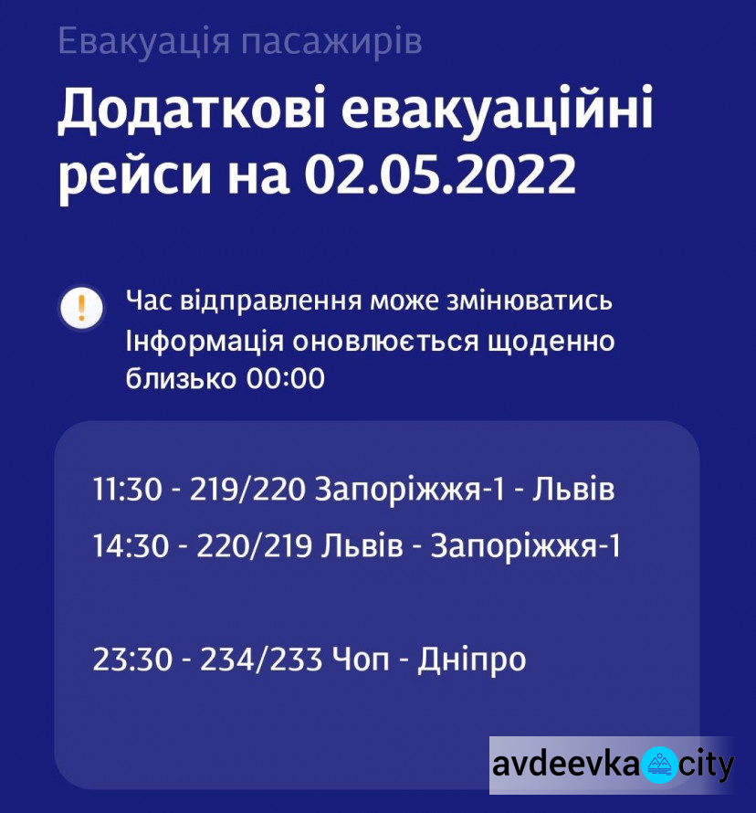 «Укрзалізниця» призначила три додаткові евакуаційні рейси на 2 травня. Про це повідомляє пресслужба перевізника.