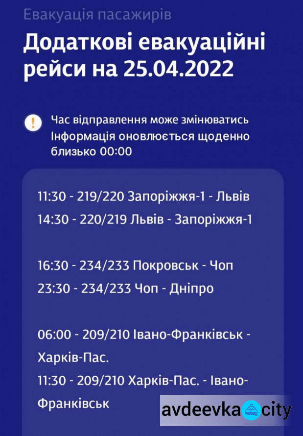 Станом на 25 квітня Укрзалізниця призначила 6 додаткових рейсів для евакуації мирного населення. Про це повідомляється на офіційному сайті компанії.Станом на 25 квітня курсуватимуть такі евакуаційні рейси: