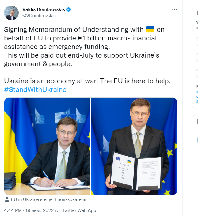"Підписую Меморандум про взаєморозуміння з Україною від імені ЄС щодо надання 1 млрд євро макрофінансової допомоги як екстрене фінансування. Її буде виплачено наприкінці липня для підтримки уряду та народу України”, – зазначив Домбровскіс.