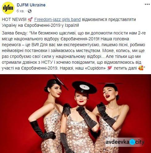 После этого занявшая второе место в Нацотборе группа Freedom Jazz также отказалась от участия в конкурсе "Евровидение".