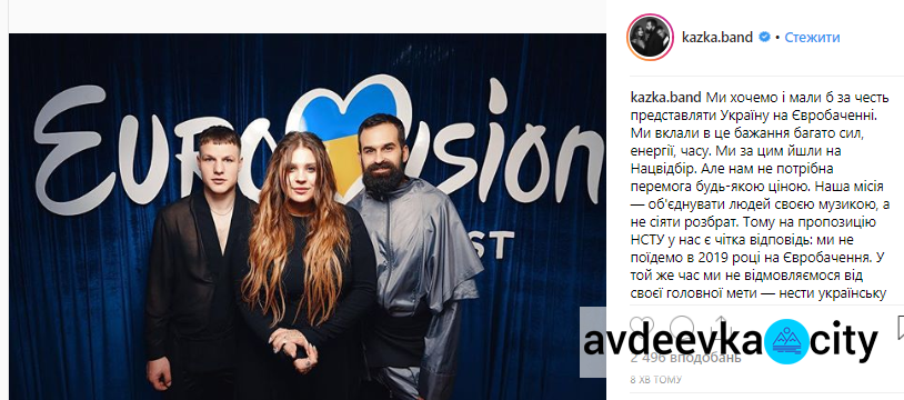"Мы хотим и почитали бы за честь представлять Украину на Евровидении. Мы вложили в это желание много сил, энергии, времени. Мы за этим шли на Нацотбор. Но нам не нужна победа любой ценой. Наша миссия - объединять людей своей музыкой, а не сеять раздор. Поэтому на предложение НОТУ у нас есть четкий ответ: мы не поедем в 2019 году на Евровидение. В то же время мы не отказываемся от своей главной цели - нести украинскую культуру миру. Мы готовы представить Украину на конкурсе в следующем году, если нас выберут. А пока мы двигаемся дальше и ждем всех вас на наших концертах", - говорится в заявлении группы .