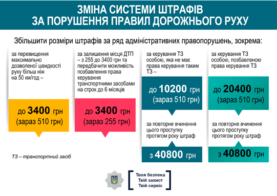 Напомним, МВД предлагает установить штраф 3400 гривен (сейчас - 510 гривен) за превышение максимально разрешенной скорости движения более чем на 50 км / ч. За оставление места ДТП предлагается установить штраф 3400 гривен и предусмотреть возможность лишения права управления транспортным средством на срок до шести месяцев. В 20 раз предлагается увеличить размер штрафа за управление транспортом без права управления (он составит 10 200 гривен, а за повторное нарушение - 40 800 гривен). Лица, лишенные права управления, нарушив закон, будут платить штраф в размере 20 400 гривен, а за повторное совершение этого нарушения в течение года - 40 800 гривен.