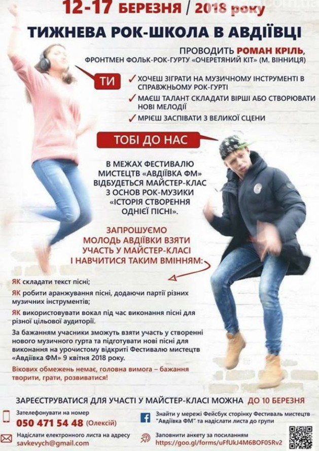 С 12 по 17 марта в рамках фестиваля искусств «Авдеевка ФМ» состоится бесплатный мастер-класс по основам рок-музыки «История создания одной песни».