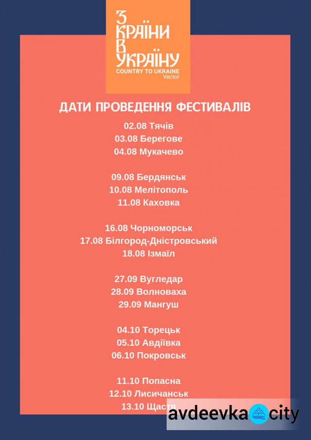 Согласно обнародованному графику, Авдеевка встретит фестиваль 5 октября. Мероприятия "З країну в Україну!" пройдут в конце сентября-начале октября в еще пяти городах Донецкой области: в Угледаре, Волновахе, Мангуше, Торецке и Покровске.