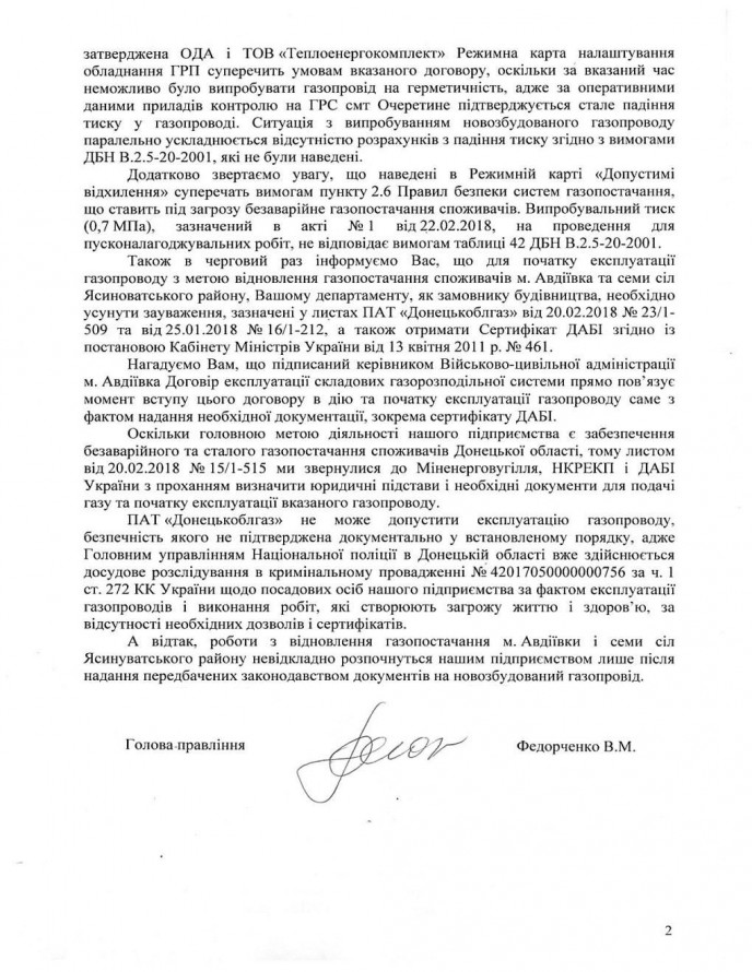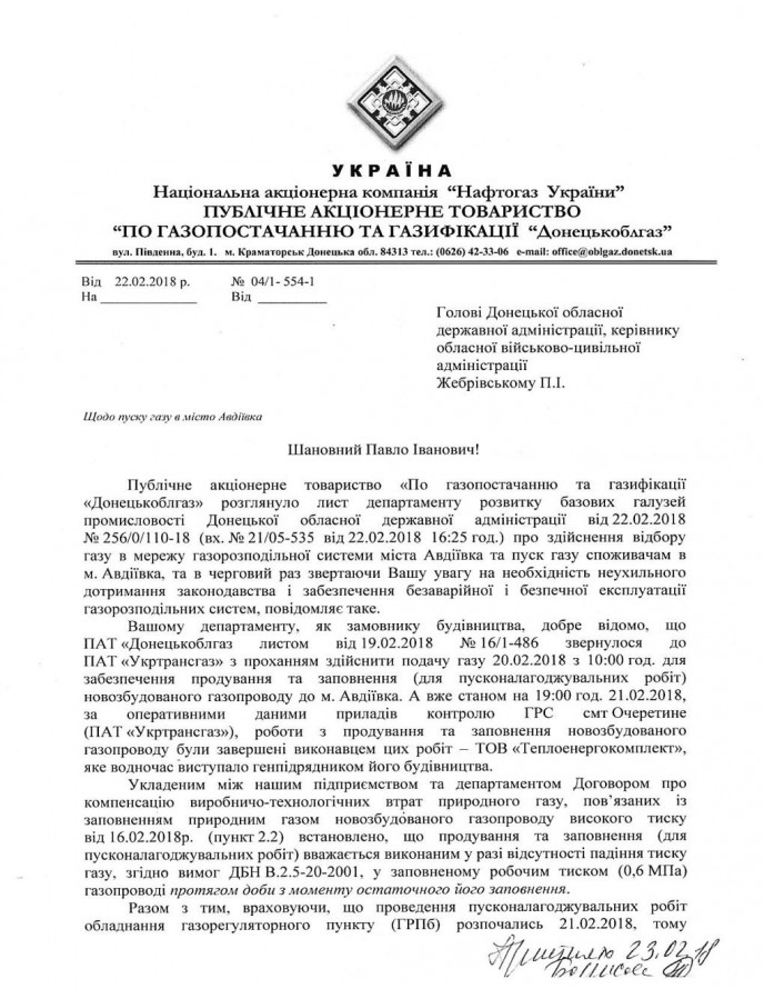 Недавно Авдеевская военно-гражданская администрация подписала договор о техническом обслуживании нового газопровода "Очеретино-Авдеевка".