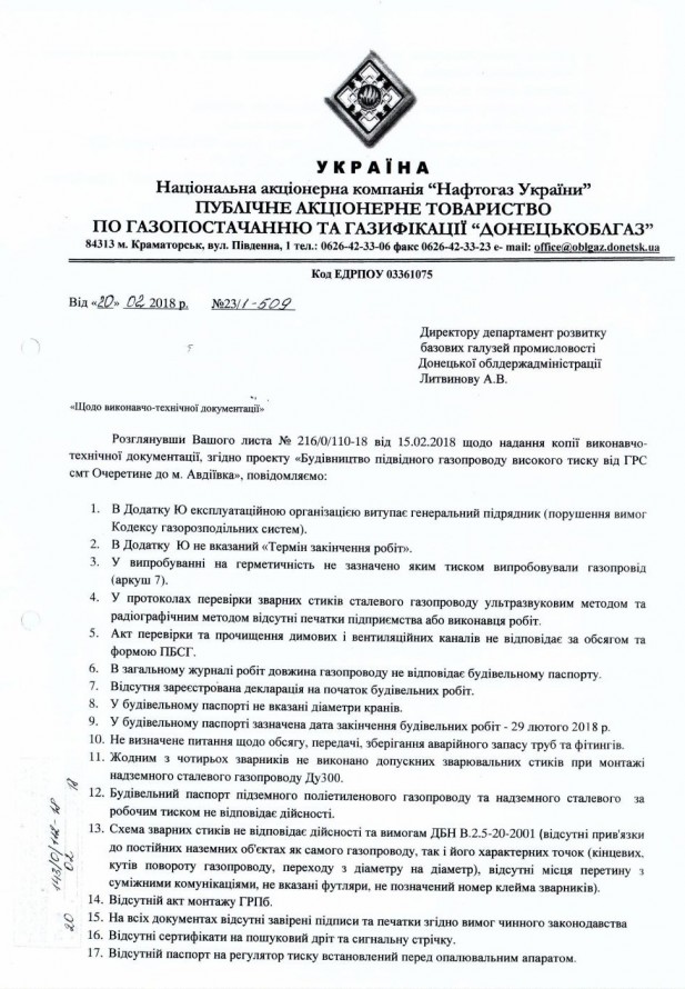 Позже министр регионального развития, строительства и жилищно-коммунального хозяйства Украины Геннадий Зубко заявил , что введение в эксплуатацию нового магистрального газопровода "Очеретино – Авдеевка" откладывается из-за саботажа со стороны "Донецкоблгаза". В том же ключе высказался и Жебривский, который даже обвинил «Донецкоблгаз» в «содействии террористическим организациям».