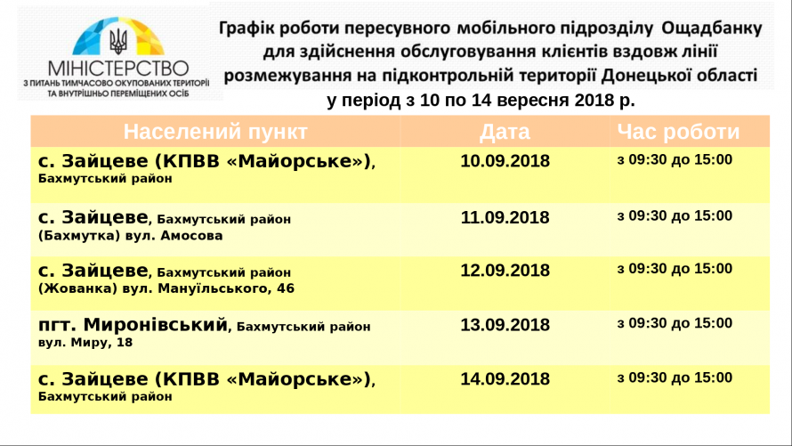 По данным Министерства по вопросам временно оккупированных территорий и внутренне перемещенных лиц, МП «Ощадбанка» будет работать 10 и 14 сентября – в Зайцево (КПВВ «Майорск», Бахмутский р-н), 11 сентября – Зайцево (Бахмутский р-н), Бахмутка, ул. Амосова, 12 сентября – Зайцево (Бахмутский р-н), Жованка, ул. Мануильского, 46, 13 сентября – Мироновский (Бахмутский р-н), ул. Мира, 18. Время работы: с 9:30 до 15:00.