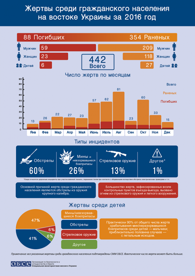 Ссылаясь на недавно опубликованный тематический отчет СММ ОБСЕ « Жертвы среди гражданского населения на востоке Украины », Глава Миссии отметил, что в 2016 году Миссия подтвердила 442 жертвы среди гражданского населения, среди которых — 88 погибших.