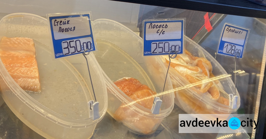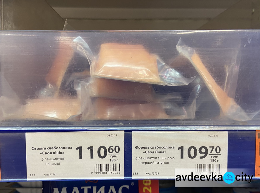 В весенний праздник авдеевцы могли приобрести в супермаркете на праздничный стол семгу и форель в вакуумной упаковке, отдав около 110 грн за кусок весом 180 г, т.е. более 600 грн за кг.