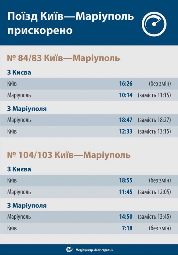 Также ускорили поезд № 104/103 Киев - Мариуполь. Он будет отправляться из Киева в 18:55 (без изменений) и прибывать в Мариуполь в 11:45 (вместо 12:05). Обратно поезд будет отправляться в 14:50 (вместо 13:45) и прибывать в столицу Приазовья в 7:18 (без изменений).