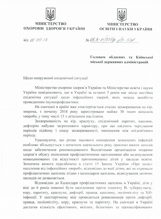 Соответствующее распоряжениет от 6 сентября 2018 года с подписями и.о. главы МОЗ Ульяны Супрун и главым Минобразования Лилии Гриневич был разослан председателям областных и Киевской городской государственной администрации.