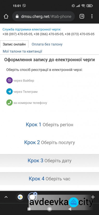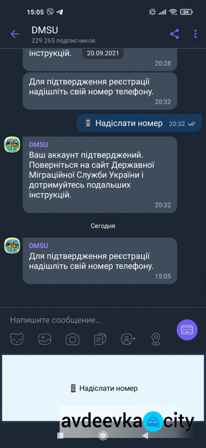 Далее необходимо выбрать способ регистрации в электронной очереди (через вайбер, телеграмм или по номеру телефона). Предположим, вы выбрали вайбер. Кликаете по необходимому варианту, и вас сразу же перекидывает в мессенджер, где чат-бот Государственной миграционной службы Украины просит вас прислать свой номер телефона для подтверждения регистрации.