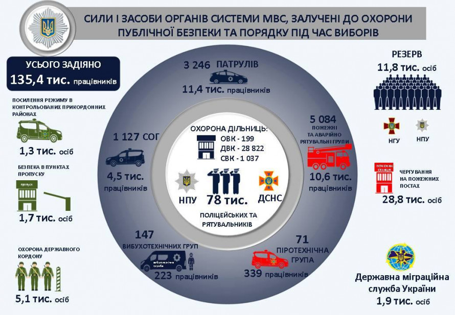 Безопасность и правопорядок в избирательных комиссиях (участковых, окружных и ЦИК) будет под присмотром 78 тысяч полицейских и спасателей. «То есть, возле КАЖДОГО избирательного участка будет постоянно дежурить 2 сотрудника полиции и один спасатель», - подчеркивает Аваков.