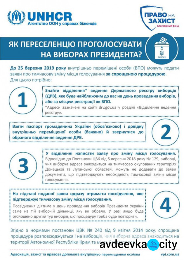 Переселенцы с оккупированной части Донецкой и Луганской областей имеют возможность наравне с остальными гражданами Украины проголосовать на выборах Президента, которые состоятся 31 марта 2019 года. Что для этого надо сделать подробно отображено в инфографике БФ "Право на защиту".