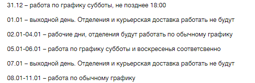 Отделения Новой почты будут выходными 1 января и 7 января. По графику субботы, не позднее 18:00, отделения будут работать 31 декабря, 6 и 7 января.