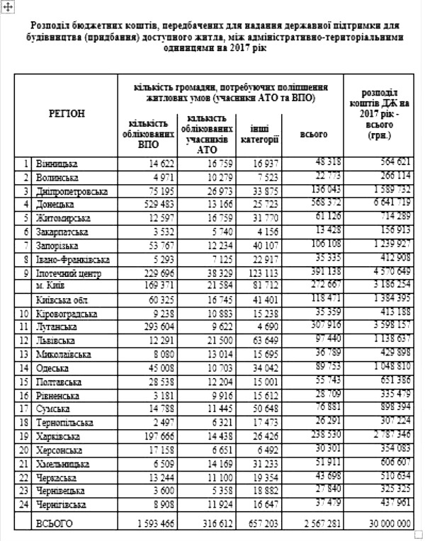 «На реализацию программы выделено 30 миллионов гривен. Понимаю, что средств немного. Но в этом году мы изменили подходы к распределению между регионами этого ресурса - в зависимости от количества участников АТО и внутренне перемещенных лиц. Именно эти категории в первую очередь будут иметь право на льготный кредит по приобретению доступного жилья» - отметил вице-премьер, министр регионального развития, строительства и жилищно-коммунального хозяйства Украины Геннадий Зубко.