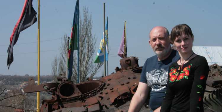 На фото один из авторов книги Сергей Деркач и Алина Косовская во время визита на авдеевскую промзону.