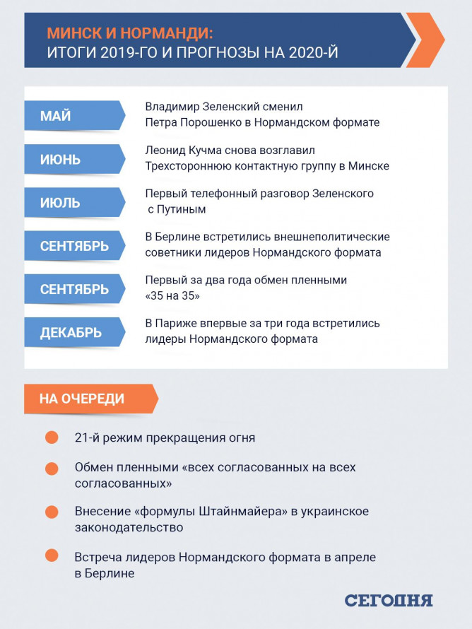 Подготовка к первой за три года встрече лидеров «нормандского формата» (Украина, Россия, Германия, Франция) шла довольно тяжело. Больше она нужна была украинской стороне и лично Зеленскому, который сделал встречу с Путиным своей главной фишкой. Поэтому Москва постоянно повышала ставки, заставив Киев подписаться под пресловутой «формулой Штайнмайера» (механизмом введения в действие закона об особом статусе Донбасса после проведения там местных выборов, – прим. ред.). С встречей лидеров «нормандской четверки» увязала Россия и разведение сил и средств у Станицы Луганской и Золотого (Луганщина), а также в районе Петровского (Донетчина).