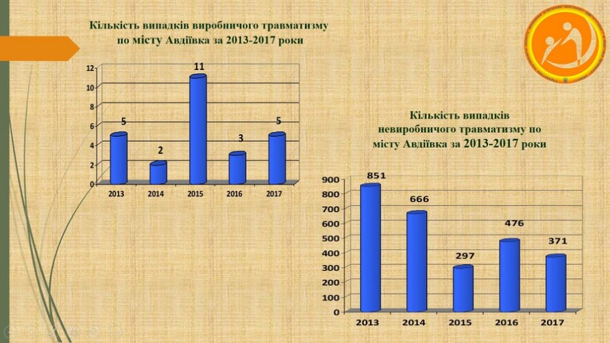 В прошлом году в отделении Фонда зарегистрировано 6 несчастных случаев на производстве (по данным Управления труда и соцзащиты населения, в 2017-м в Авдеевке зафиксировано 5 случаев производственного травматизма – см. инфографику), включая 2 с инвалидностью.