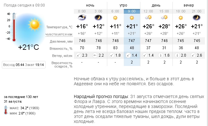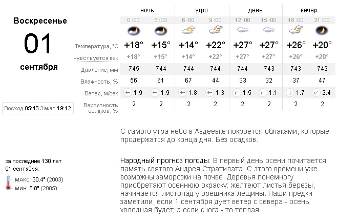 В первый день осени, 1 сентября, которое выдалась на воскресенье (поэтому школьники Авдеевки пойдут на Первый звонок 2 сентября), с самого утра небо в Авдеевке покроется облаками, которые продержатся до конца дня. Без осадков. Минимальная температура будет ранним утром (+14), максимальная после полудня (+ 27), сообщает sinoptik.ua