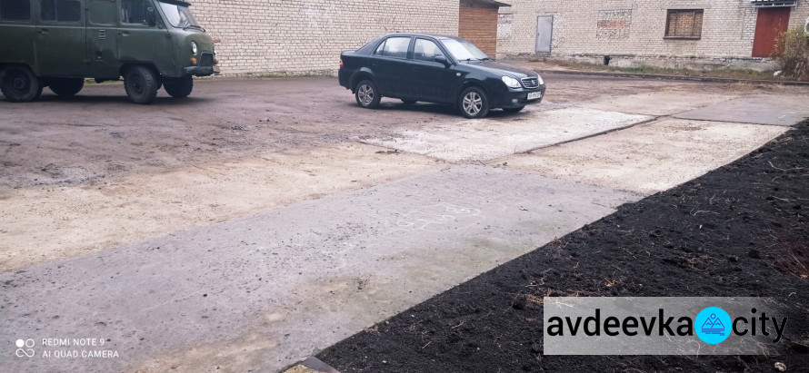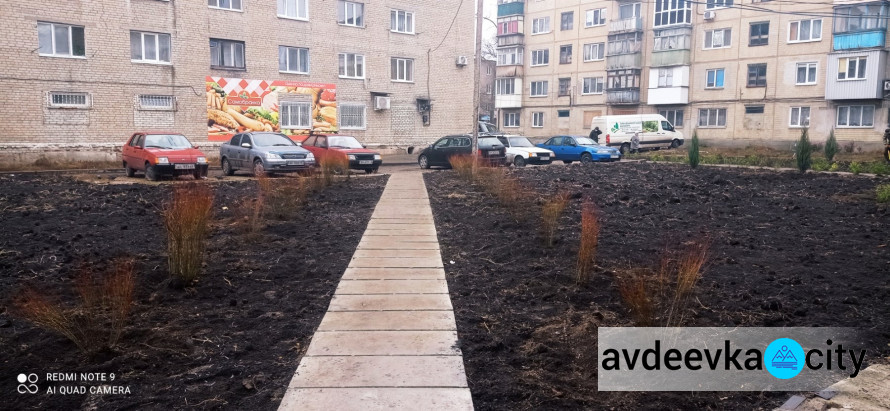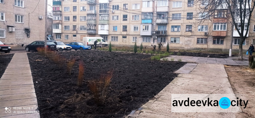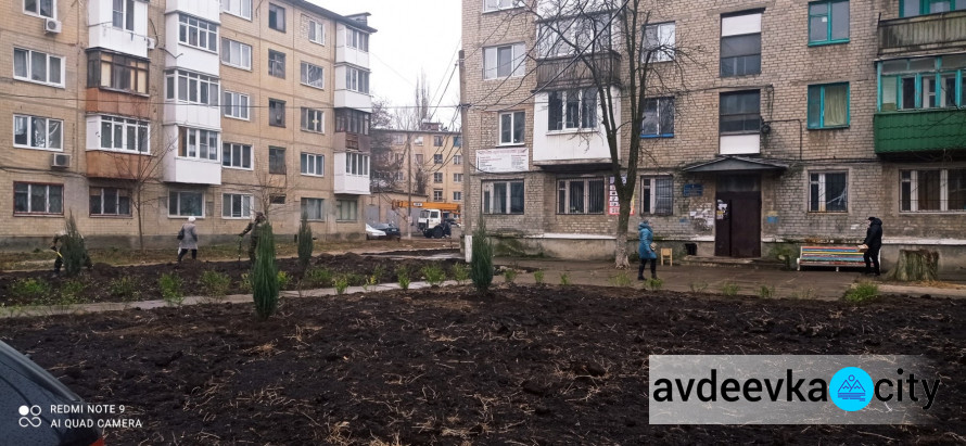 В Авдеевке напротив третьего отделения Новой почты, расположенного по адресу ул. Гагарина, 12а, продолжается благоустройство территории. Работники КП «СЕЗ» приступили к озеленению территории двора.