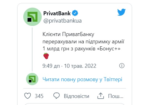 Користувачі ПриватБанку перерахували бонусних коштів на суму 1 млрд грн на підтримку воїнів Збройних сил України. Про це повідомляє представництво компанії у твітері.