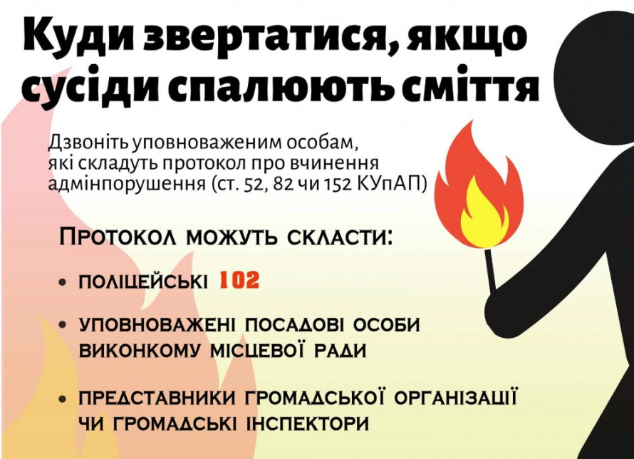 Согласно статье 255 Административного кодекса полиция обязана отреагировать на ваше обращение и выехать на место преступления (сжигания листьев), чтобы составить протокол. Далее эти данные направляются в Государственную экологическую инспекцию, которая уже рассматривает дела и привлекает виновников к ответственности.