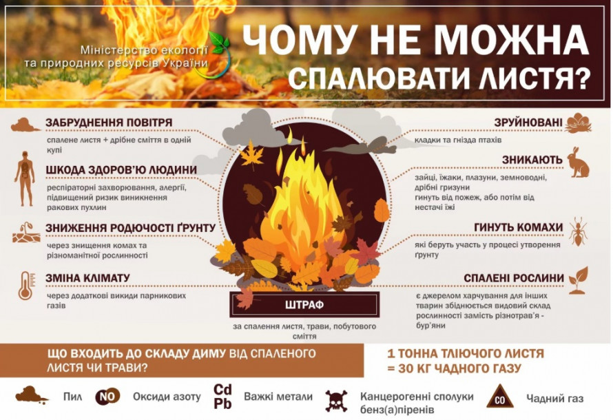 В соответствии с ними, сжигание листьев на приусадебном участке является нарушением государственных стандартов, норм и правил в сфере благоустройства населенных пунктов и грозит наложением штрафа на граждан в размере от 20 (340 грн) до 80 (1360 грн) необлагаемых минимумов доходов граждан, а на должностных лиц, граждан-субъектов предпринимательской деятельности – от 50 (850 грн) до 100 (1700 грн) НМДГ.