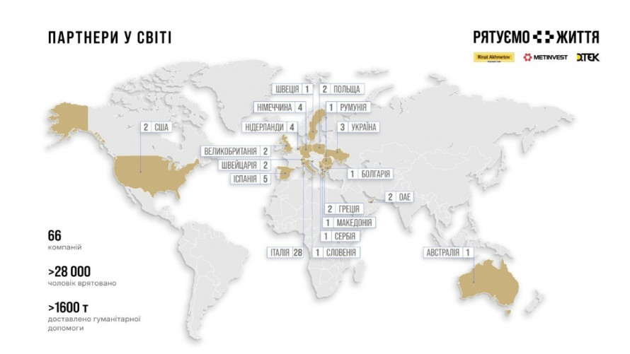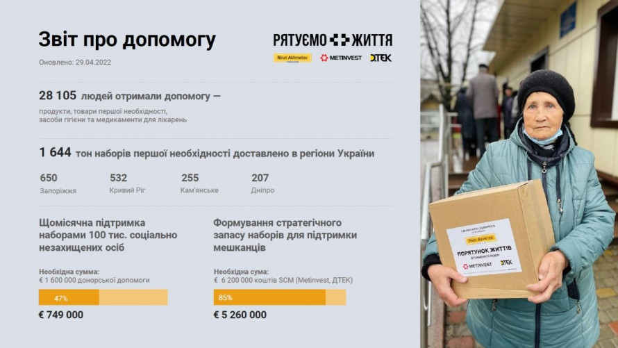 Протягом двох місяців 28 105 людей уже отримали допомогу від гуманітарного проєкту «Рятуємо життя». Завдяки пожертвам майже семи десятків компаній зі всього світу в постраждалі від війни регіони України було доставлено 1644 тонни пакунків - продуктів, товарів першої потреби, засобів гігієни та медикаментів для лікарень.