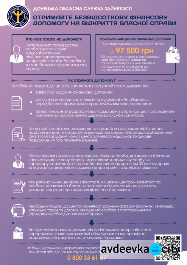 Допомога на здобуття економічної самостійності малозабезпеченої сім’ї надається одноразово у безготівковій формі на оплату витрат на закупівлю обладнання та матеріалів. Для отримання фінансової допомоги потрібно звернутись із пакетом документів до центру зайнятості за місцем проживання.