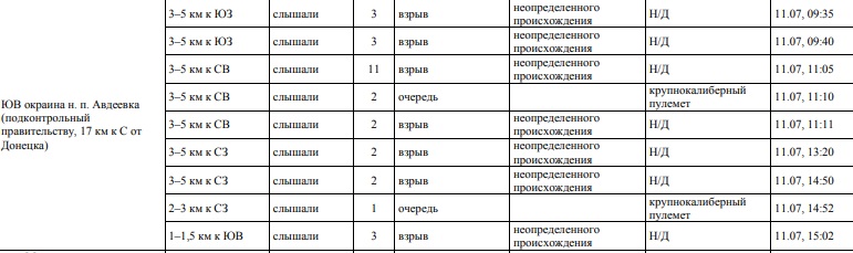 В таблице НРПО оказалась и Авдеевка: 11 июля в период с 09:35 до 15:02 на юго-восточной окраине города представители СММ зафиксировали около 30 взрывов неопределенного происхождения.