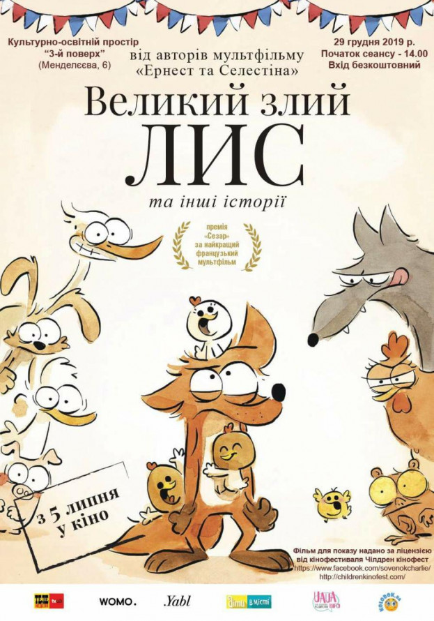 Також сьогодні у культурно-освітньому просторі "3-й поверх" вібдудеться показ мультфильму "Великий злий Лис". Початок сеансу - 14.00, вхід - безкоштовний.