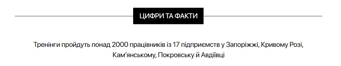 Навчання стартувало на початку серпня й триватиме два місяці. Перші тренінги вже пройшли в Запоріжжі та Кривому Розі. Їх ведуть досвідчені сертифіковані тренери. Співробітники Метінвесту навчатимуться в групах по 20 осіб. Кожен тренінг розрахований на два дні. Перший день – теоретична підготовка з практичним закріпленням матеріалу. Другий день повністю присвячений практиці. За словами тренерів, навчання сфокусоване на нагальних потребах сьогодення.