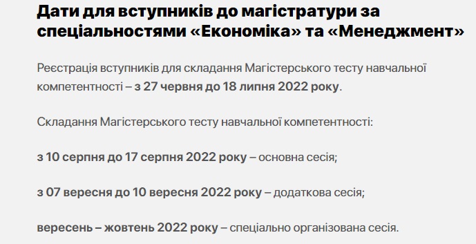 Щоб вступити на спеціальності 051 «Економіка» та 073 «Менеджмент», потрібно скласти магістерський тест навчальної компетентності (або пройти індивідуальну усну співбесіду з іноземної мови, якщо вступник вже має диплом магістра чи спеціаліста) та фаховий іспит, а також написати мотиваційний лист.