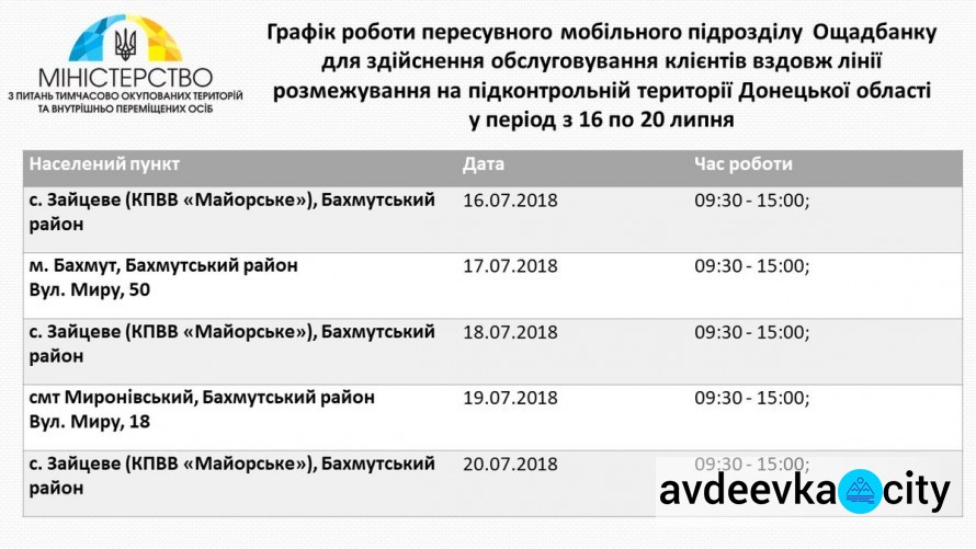 Мобильное подразделение "Ощадбанка " будут работать у линии соприкосновения в Донецкой области с 16 по 20 июля. Соответствующий график работы обнародовало министерство по вопросам временно оккупированных территорий и внутренне перемещенных лиц (ВПЛ) Украины.