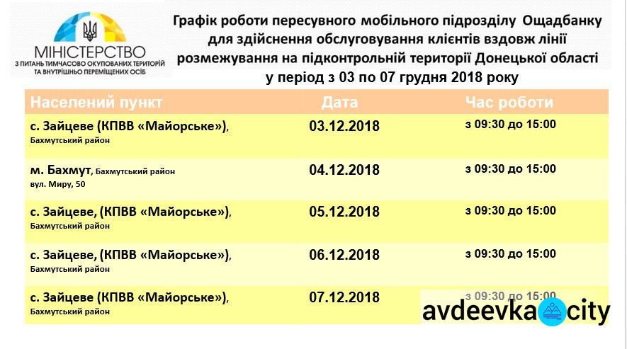 Мобильное подразделение Ощадбанка в период с 3 по 7 декабря будет работать в районе КПВВ "Майорское" и в Бахмуте. Об этом сообщает пресс-служба Министерства по вопросам временно оккупированных территорий и внутренне перемещенных лиц в Twitter.