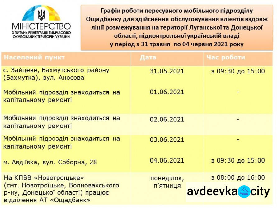 Передвижное мобильное подразделение «Ощадбанка» с 31 мая по 4 июня будет работать в Зайцево и Авдеевке , сообщает avdeevka.city со ссылкой на пресс-службу Министерства по вопросам реинтеграции временно оккупированных территорий.