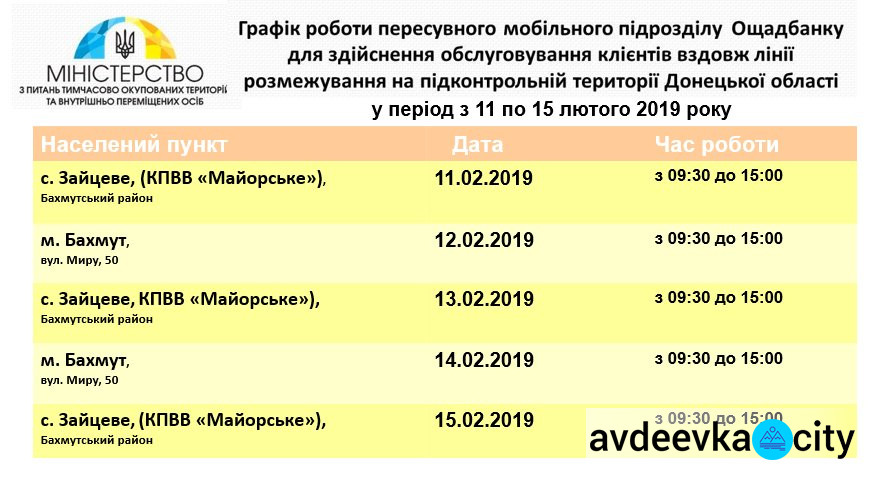 В Донецкой области МП "Ощадбанка" на текущей неделе будет работать в Бахмуте и Зайцево (КПВВ "Майорское").
