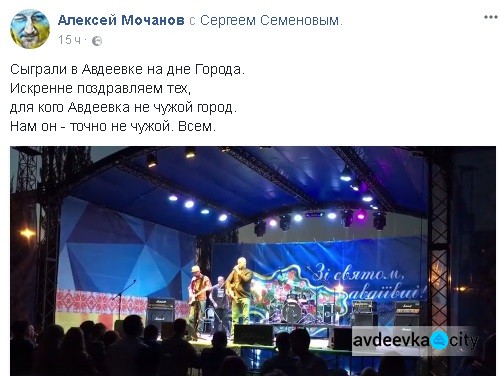 «Сыграли в Авдеевке на дне Города. Искренне поздравляем тех, для кого Авдеевка не чужой город. Нам он - точно не чужой. Всем», - написал Алексей на своей странице в Фейсбук.