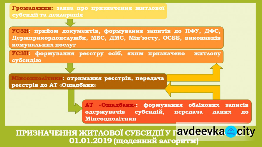Управление социальной защиты населения военно-гражданской администрации Авдеевки показало алгоритм предоставления жилищной субсидии населению в денежной форме.