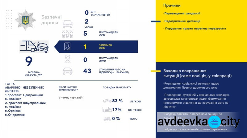 Чаще всего ДТП в городе происходили в темное время суток. 83% из них приходится на легковые авто, 17% - на грузовые.