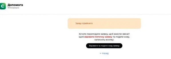 Важливо. При статусі “Заяву прийнято” заявник може відкликати свою заяву та подати її повторно. Ця можливість може бути корисною, якщо був зазначений невірний IBAN або взагалі не зазначений, а також якщо були допущені інші помилки або не вся інформація введена.