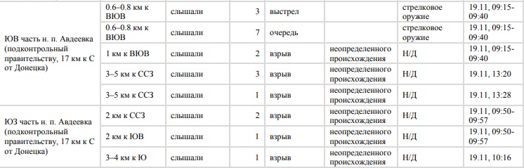 Согласно последнему отчету СММ ОБСЕ (опубликован вечером 20 ноября), наблюдатели слышали выстрелы (стрелковое оружие, пулемет) и взрывы в разных частях Авдеевки.