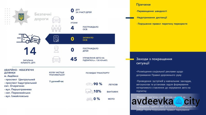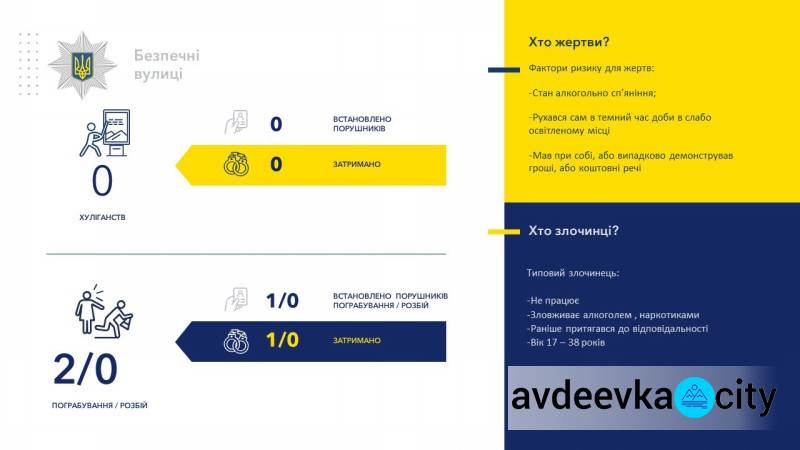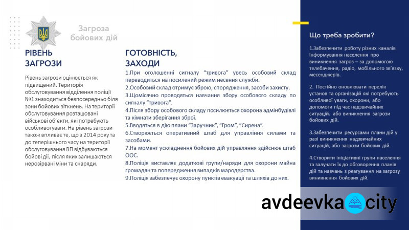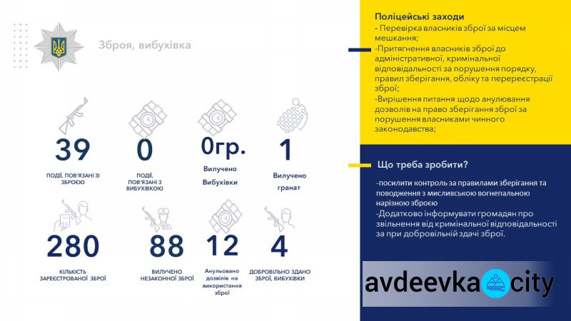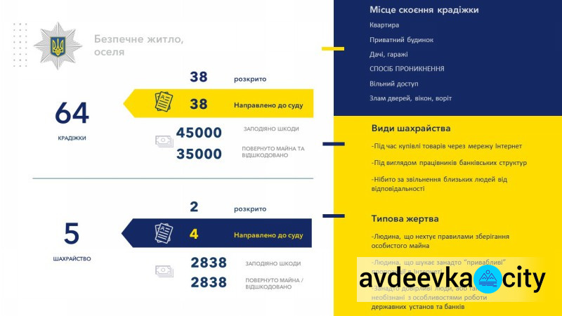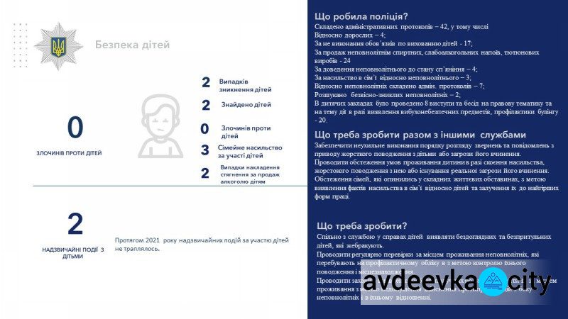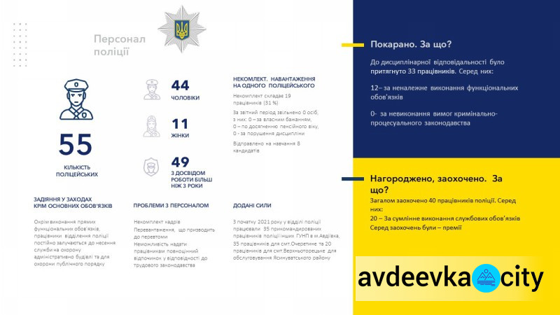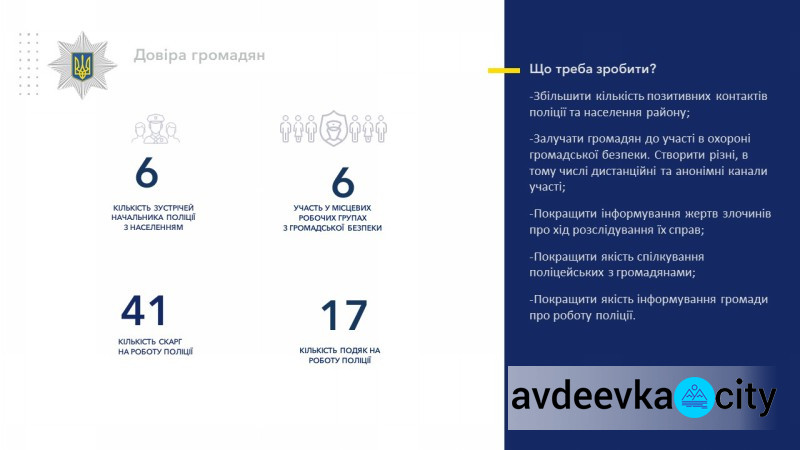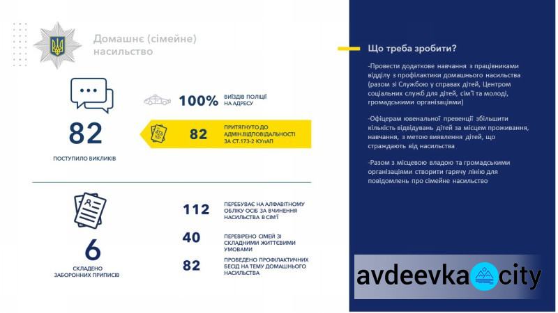 Звіт Авдіївського відділення поліції перед громадянами за усіма напрямками роботи поліції на території обслуговування представлений у вигляді інфографіки, повідомляє avdeevka.city.