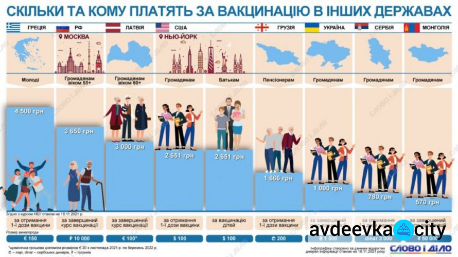 Грошову винагороду за вакцинацію від коронавірусу отримають мешканці восьми країн, суми варіюються від 570 до 4500 гривень, повідомляє avdeevka.city з посиланням на аналітичний портал «Слово і діло».