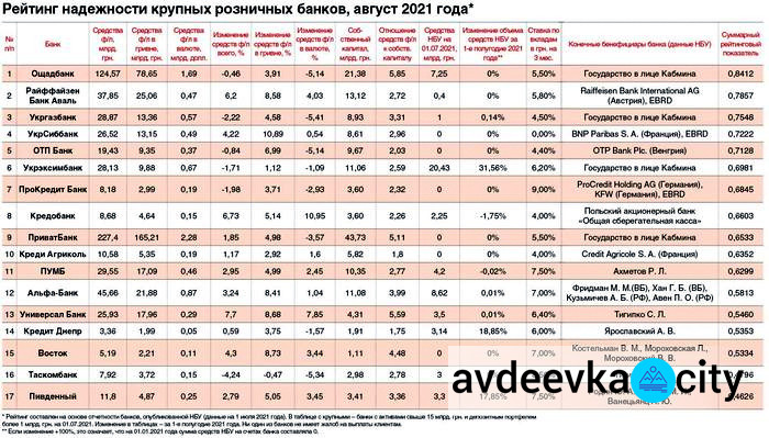 Рейтинг самых надежных банков по состоянию на август сформировало издание Деньги.ua. Журналисты использовали отчеты от 1 июля, обнародованные на сайте Национального банка Украины.