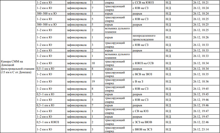 В период с вечера 26 декабря по вечер 27 декабря Миссия констатировала увеличение количества нарушений режима прекращения огня в Донецкой области, зафиксировав, среди прочего, приблизительно 130 взрывов, по сравнению с предыдущими сутками (50 взрывов). Большинство нарушений режима прекращения огня, в том числе большинство взрывов, зафиксировано в районе треугольника Авдеевка–Ясиноватая–Донецкий аэропорт, включая 6 взрывов, оцененных как разрывы снарядов на расстоянии ориентировочно 300–500 м к югу от камеры СММ, установленной на Донецкой фильтровальной станции (ДФС;