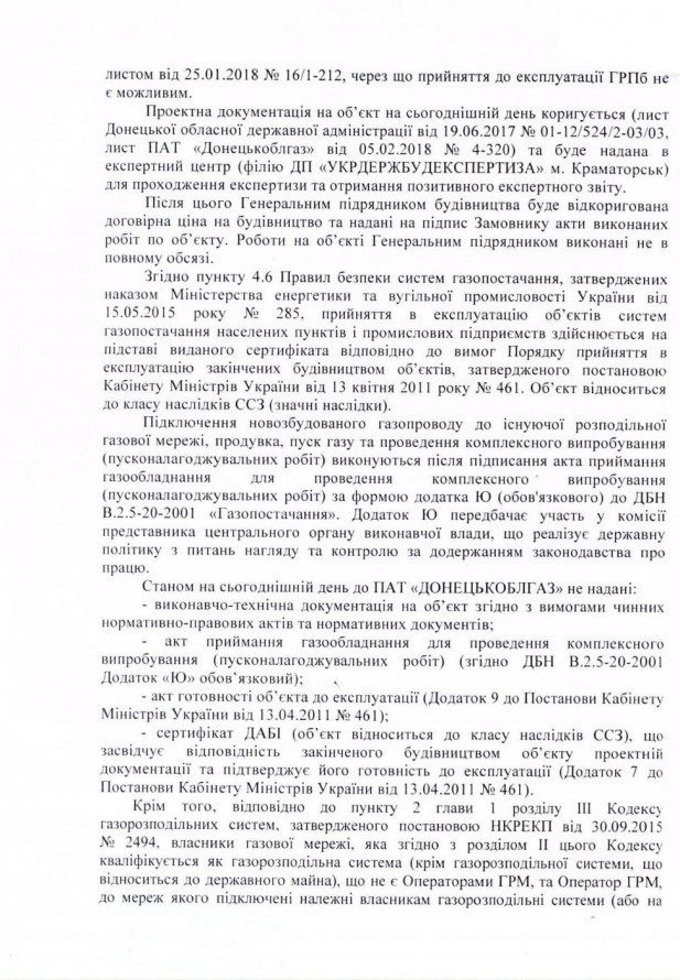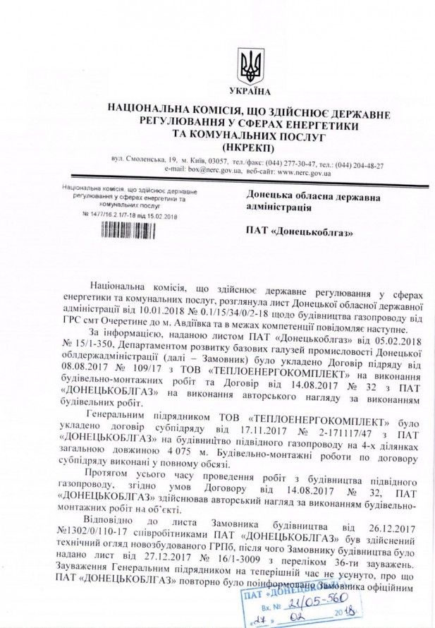 Позже министр регионального развития, строительства и жилищно-коммунального хозяйства Украины Геннадий Зубко заявил , что введение в эксплуатацию нового магистрального газопровода "Очеретино – Авдеевка" откладывается из-за саботажа со стороны "Донецкоблгаза". В том же ключе высказался и Жебривский, который даже обвинил «Донецкоблгаз» в «содействии террористическим организациям».