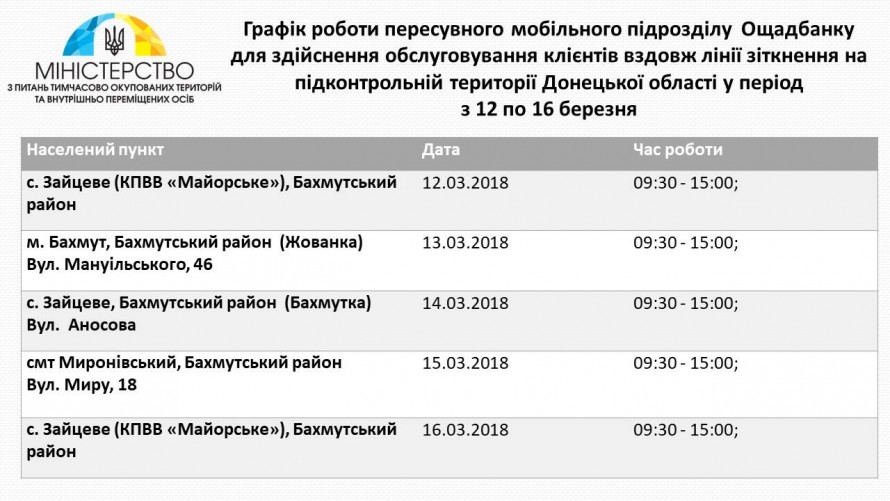 Министерством по вопросам временно оккупированных территорий и внутренне перемещенных лиц (ВПЛ) Украины опубликован новый график работы мобильных подразделений Ощадбанка в прифронтовой зоне Донетчины.