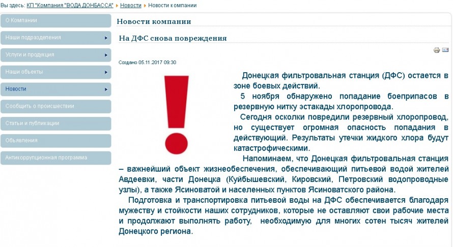 «Осколки повредили резервный хлоропровод, но существует огромная опасность попадания в действующий, - отмечет КП «Вода Донбасса». - Результаты утечки жидкого хлора будут катастрофическими».